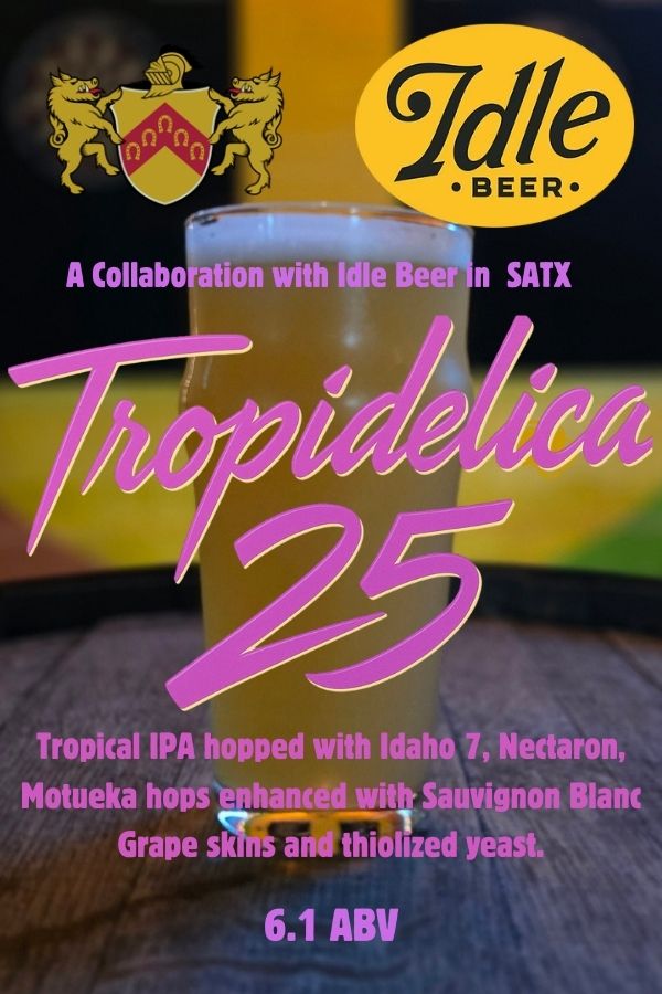 Our 2025 collaboration with San Antonio’s Idle Beer Hall still boasts bright tropical, citrus and dank flavors and aromas from additions of American and New Zealand hops in the mash, kettle, whirlpool and dry hopping. This year we’ve added Marlborough Sauvignon Blanc grape skins and fermented with thiolized yeast to boost thiol biotransformation in the hops and grape skins. This process adds passion fruit and guava notes, making this year’s version of Tropidelica Hazy IPA brighter, juicier and more tropical than ever!