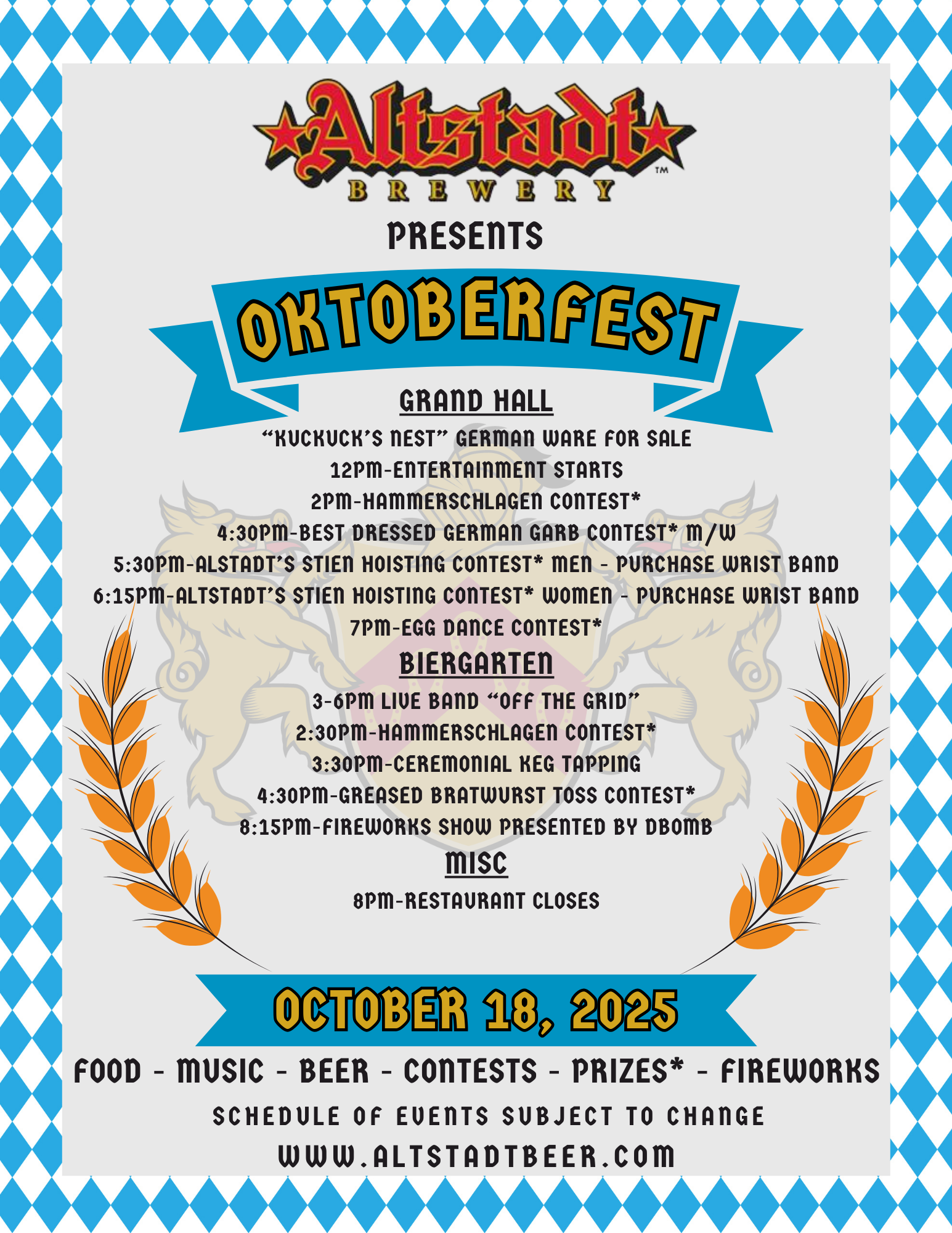 Join us for a fun-filled day of German food, music, contests, and entertainment at the upcoming event on October 18, 2025, at the Grand Hall and Biergarten! From the exciting Hammerschlagen competition to the highly anticipated Stein Hoisting Competition for both men and women, there’s something for everyone. Don’t miss out on the German Garb Contest, the hilarious Greased Bratwurst Toss, and the always-entertaining Egg Dance. Cap off the evening with a spectacular Fireworks Show, presented by DBomb. Check out the full schedule below and get ready for an unforgettable experience!