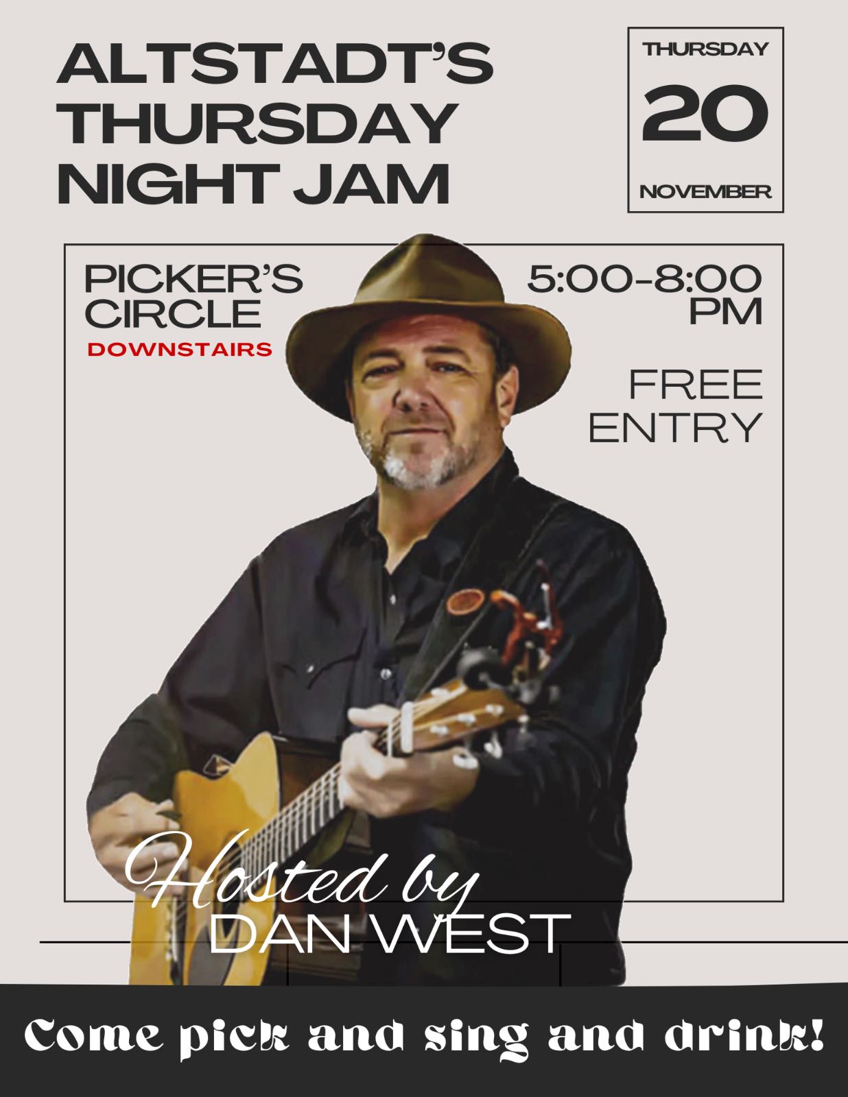 Come pick, drink and sing! This week's Thursday Night Jam is hosted by Dan West in the downstairs Rathskellar bar from 5-8pm. Entry is FREE!